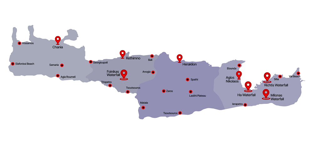 Der Wasserfall in der Kourtaliotiko-Schlucht gilt als einer der beeindruckendsten auf Kreta und befindet sich in einer der bekanntesten Naturlandschaften der Insel. Nur wenige Autominuten vom malerischen Dorf Plakias entfernt, ist er mit dem passenden Fahrzeug bequem und komfortabel zu erreichen.