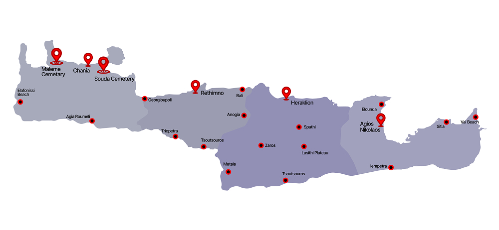 Mehr als 15.000 deutsche Soldaten verloren während des Zweiten Weltkriegs auf griechischem Boden ihr Leben. Es gibt zwei Friedhöfe in Griechenland für deutsche Soldaten, einer davon liegt auf Kreta. Er befindet sich 20 km westlich von Chania an der Nordküste und 1 km über dem Dorf Maleme und beherbergt 4.465 deutsche Soldaten. Gegründet 1974 vom ehemaligen deutschen Kommandeur Gericke und heute gepflegt von der Deutschen Kriegsgräberfürsorge, bietet der Friedhof einen Blick auf die tiefblaue Bucht von Chania. Die meisten hier gefallenen deutschen Soldaten waren Fallschirmjäger, die während der Invasion starben. Eine mehrsprachige Ausstellung zeigt die Namen der hier Ruhenden, die nicht vergessen werden.